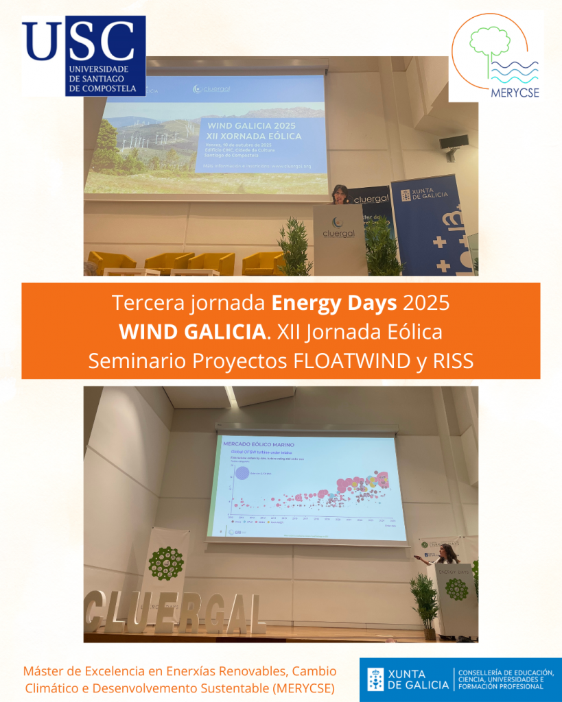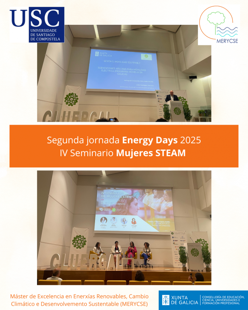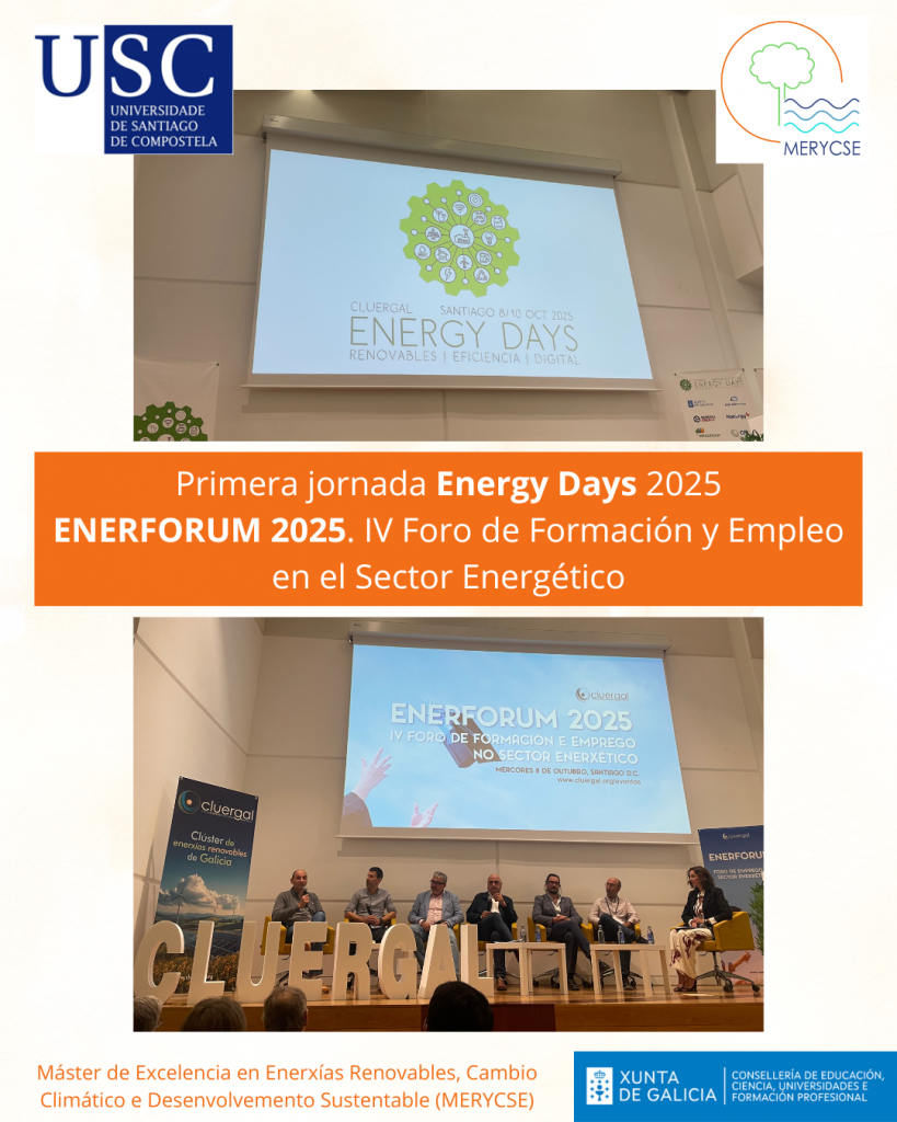 Entre los días 8 y 10 de octubre, los alumnos del Máster Universitario en Energías Renovables, Cambio Climático y Desarrollo Sostenible de la Universidad de Santiago de Compostela tuvieron la oportunidad de participar en los Energy Days, celebrados en la Ciudad de la Cultura de Santiago de Compostela.